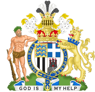 Crest: A Buck at gaze Argent, attired Or. Supporters: On either side a Bull Argent, armed and unguled proper, gorged with a Naval Crown Azure, therefrom a Chain reflexed over the back Gold, and pendent from the crown an Escutcheon Azure, charged with an Anchor erect, encircled by a Wreath of Laurel Or. MottoTOUT BIEN OU RIEN