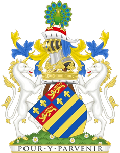 Coronet A Coronet of a DukeCrest On a Chapeau Gules turned up Ermine a Peacock in its pride proper Escutcheon Or two Bars Azure a Chief quarterly of the last and Gules, in the first and fourth, two Fleur-de-lis, and in the second and third, a Lion passant guardant, all Or Supporters On either side a Unicorn Argent armed, maned, tufted and unguled Or Motto Pour Y Parvenir ("So as to accomplish it")