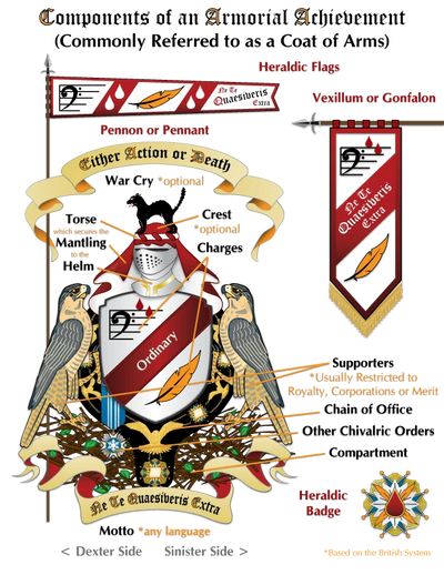 Some title holders also choose to adopt their family coat of arms, or have a new coat of arms commissioned by the Collage of Arms.